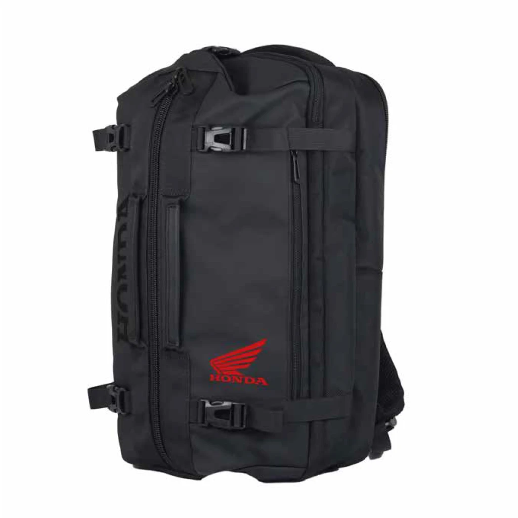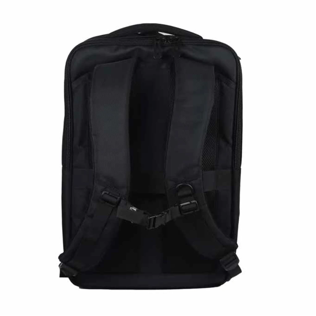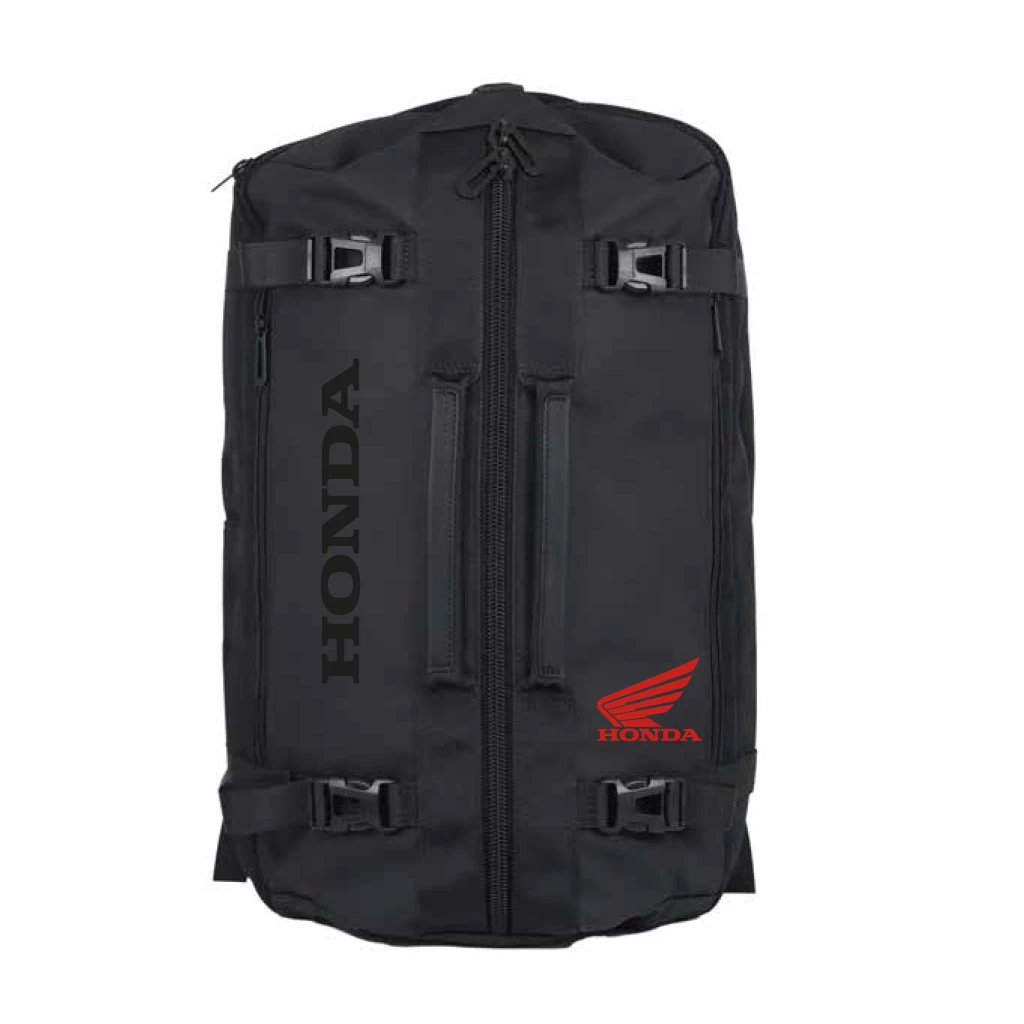 Mochila negra con cierre y correas a tono, estampas termotrasnferibes en frente.